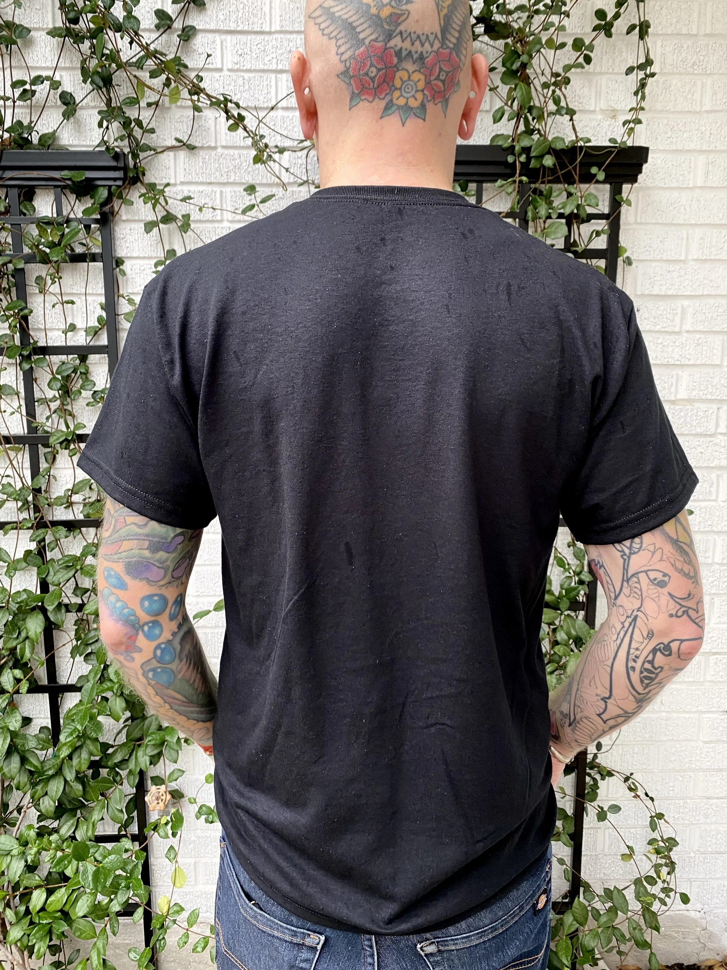 Skull rider on a motorcycle with his turquoise rings on display. White and blue print on black Gildan unisex tees. Sizes Small through XL available in limited quantities.